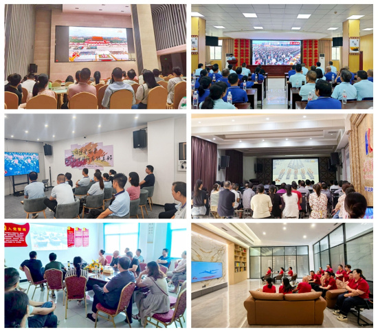 同时,在集团党委号召下,三峡物流园、宏信地产、崟锦包装、协丰印刷、宏晨包装、天台包装、有为彩印等成员企业分别设立分会场,组织员工集中观看阅兵盛况。各分会场气氛庄重热烈,员工们全神贯注观看直播,与主会场同步感受阅兵式的震撼场面,共同接受爱国主义教育的洗礼,进一步激发了作为中国人的民族自豪感和为企业发展贡献力量的使命感。