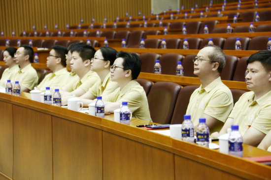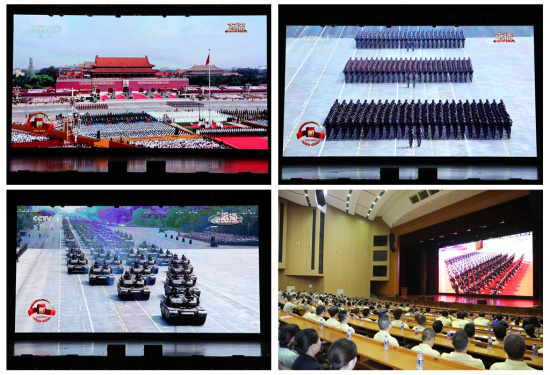 阅兵式开始后,现场时而寂静无声,时而爆发出雷鸣般的掌声。直升机梯队护卫着党旗、国旗、军旗飞过天安门上空时,人群中发出阵阵惊叹;当威武帅气、整齐划一的方队迈着铿锵步伐通过检阅台时,员工们不由自主地挺直腰板;当新型主战坦克、隐形战机、高超声速导弹、核导弹等“大国重器”出现时,大家纷纷举起手机记录这激动人心的时刻。整个阅兵环节,礼堂内惊叹声、掌声此起彼伏,员工们的民族自豪感、发展成就感、奋斗责任感油然而生。