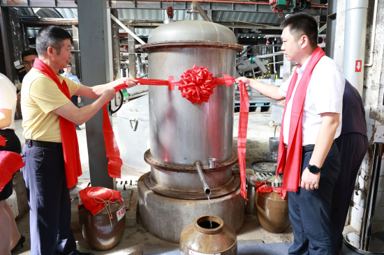 在主持人的引导下,领导与嘉宾们兴致盎然地行至酒甑前。蒸汽袅袅,酒香四溢,已然令人微醺。李大攀、谢永文为酒甑揭开红绸,开启新酿。只见清亮剔透、散发着温热气息的酒液缓缓流出,精准地落入坛中,发出清脆悦耳的声响。在升腾的酒香中,大家一同举杯,品饮秋酿,深刻感受美酒背后承载的文化与匠心。