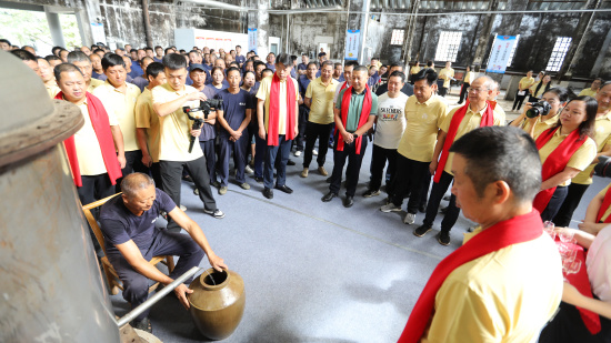 随着工序运行,在车间二楼的馏酒区,融合了清、酱、浓三香的风味升腾而起,弥漫在车间上空,让人未饮先醉。与会领导和嘉宾们近距离观摩酿酒师傅馏酒取酒,共同品鉴秋酿馫香头酒。大家举起酒杯,细细品味,充分感受“一品三香”的酒体特色,脸上流露出惊喜、赞叹与回味的神情,此刻馫香美酒成为连接匠人与消费者的美好桥梁。